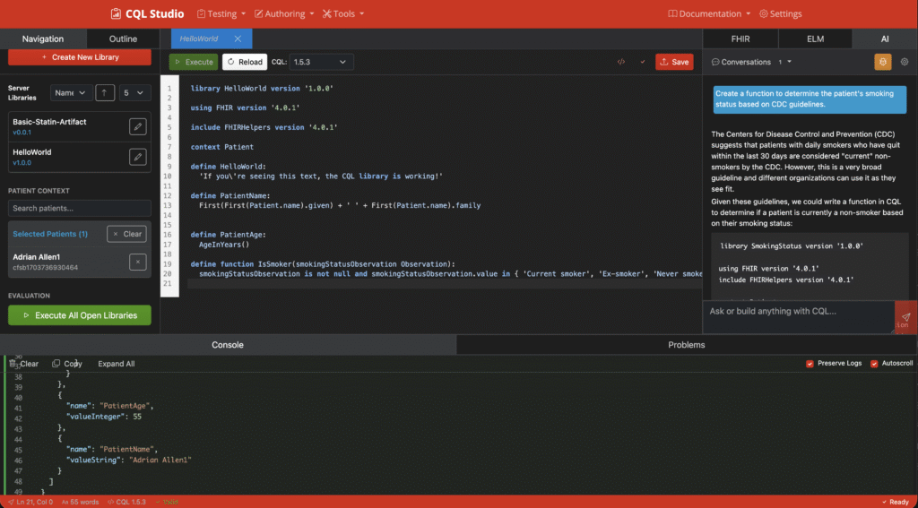 - AI-Powered Assistant: Context-aware help for writing and debugging CQL expressions